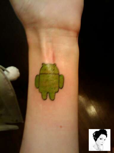 with her new green Android tattoo on the underside of her left forearm.